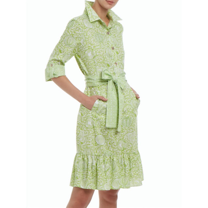 Pair with your favorite sandals for an effortlessly chic look.Flattering cut flounce bottom belted dress with contrasting print fabric on belt, cuffs, and plaquette