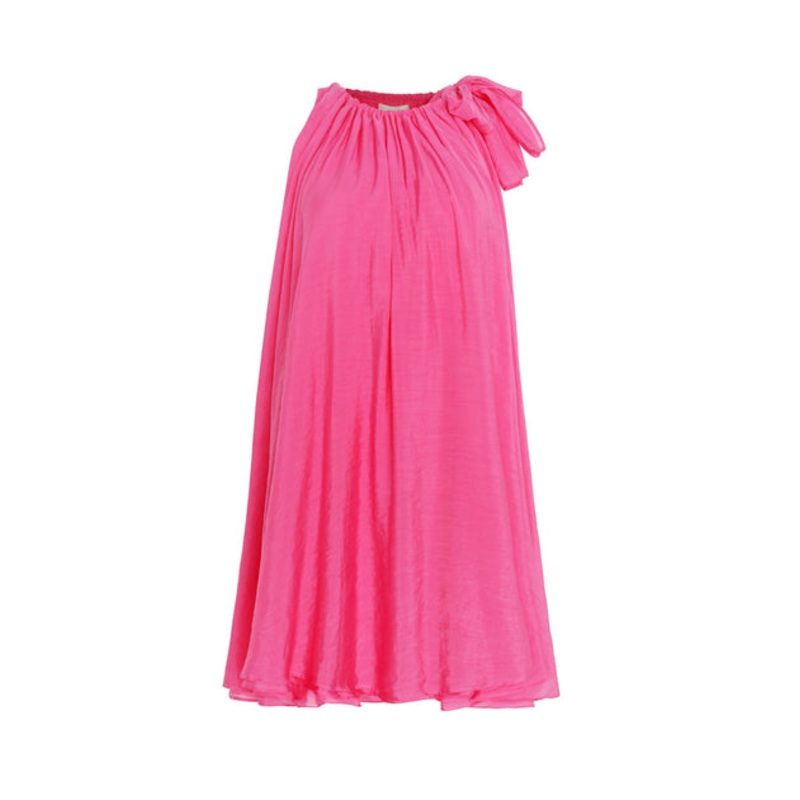 Mini dress. Layered fabrication. A-line silhouette creates volume. Adjustable neck tie detail. Dress is fully lined in self-fabrication. 65% rayon, 35% nylon. Model wears size 8/small and measures – Bust – 81cm waist – 62cm hip – 91cm height – 176cm.