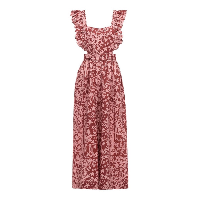 Birds print. Apron-style/ Square neckline. Flutter sleeves. Open-back. Removable top. Can be worn as pants. High waist. Slash pockets. Wide leg. Unlined. 100% Linen.