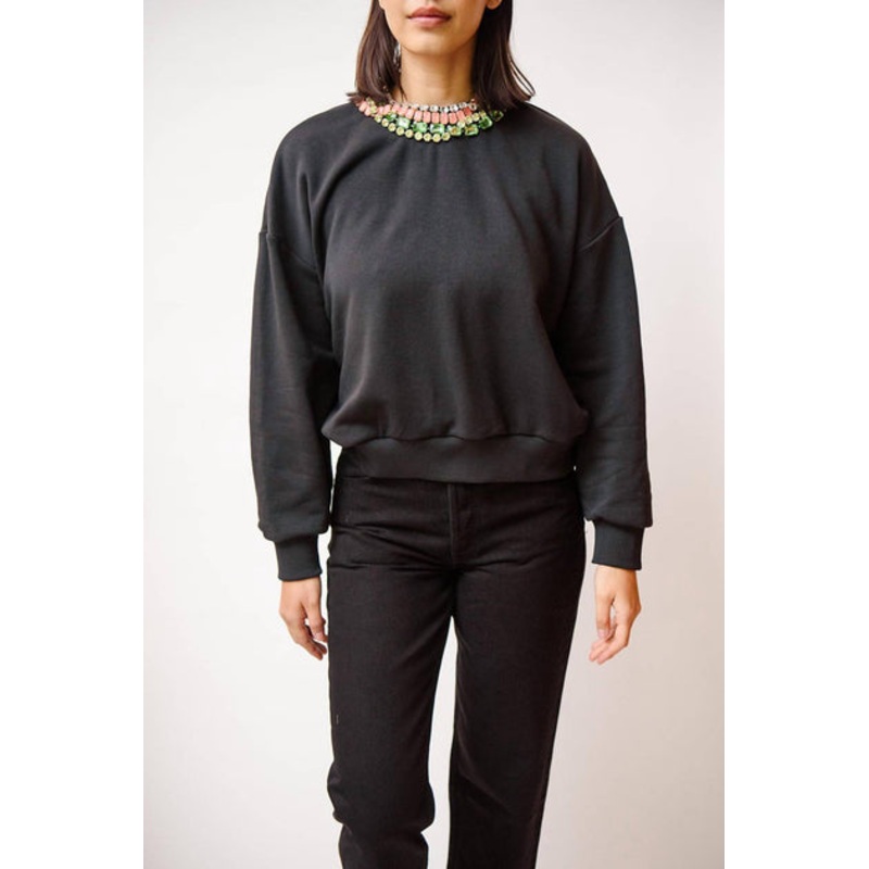 Long sleeve sweatshirt. Features a neckline embellished with multicolor rhinestones. Relaxed Fit. Cropped length. 50% Cotton 50% polyester. Dry Clean